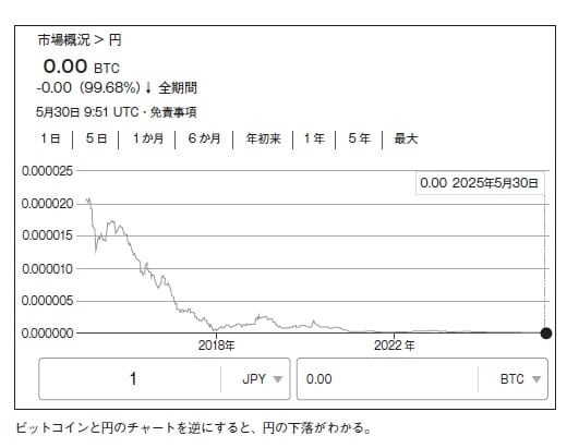 実際、ビットコインと円の為替チャートを比較してみると、表面上はビットコインが上昇しているように見えますが、裏を返せば「円が相対的に下落している」ことがよくわかります。