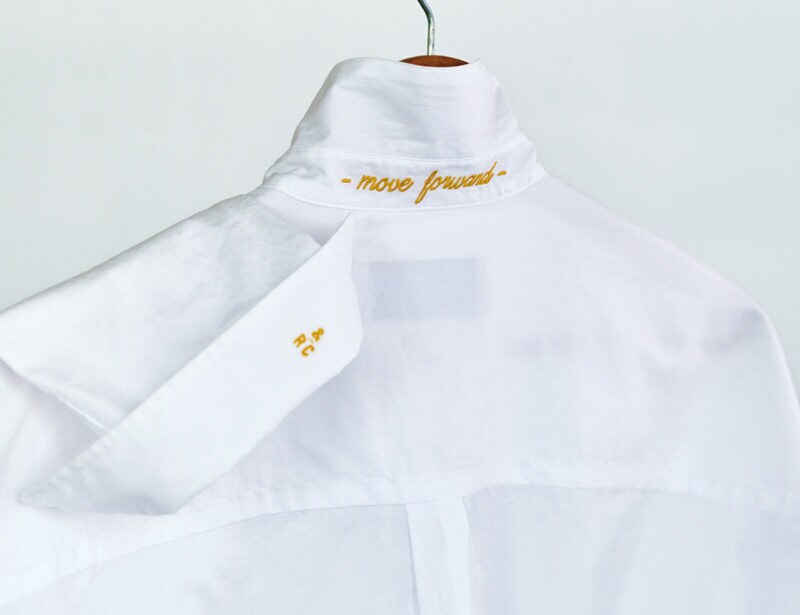 衿裏と袖口に刺しゅうがあり、衿を立てて着たときのワンポイントになるのがおしゃれ。ハリのある素材で決まりやすい。