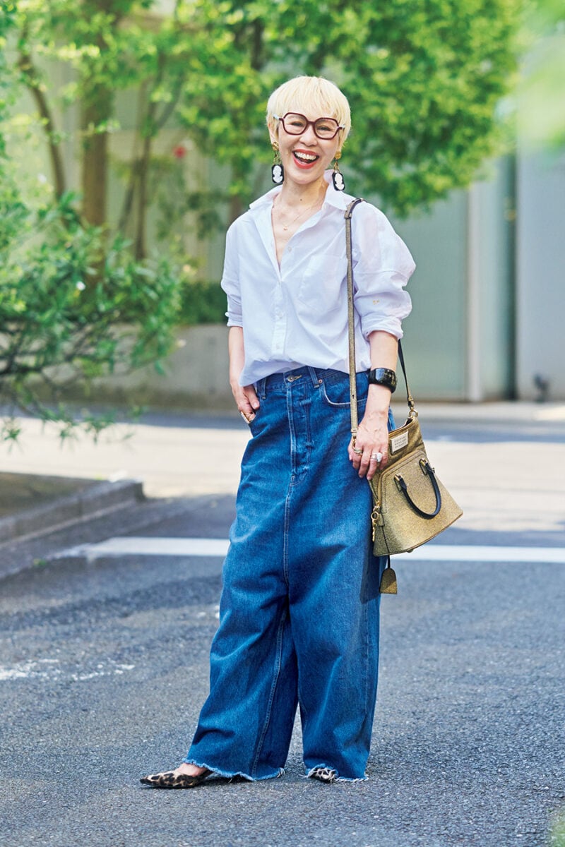 シャツ、デニム/ともにカレンソロジー、パンプス/ウィムガゼット、バッグ/メゾン マルジェラ、イヤリング/ネコアフロ、バングル/トゥデイズスペシャル、メガネ/ファースアファース(グランパグラス)