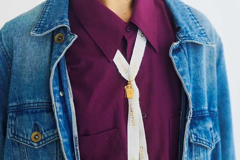 シャネルの包装用リボンに付属していたチャームを合わせたネクタイ風コーデ。