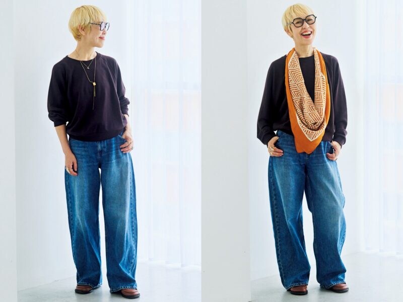 サイズ感もばっちりだけれど、小物づかいでさらにイメージチェンジ。