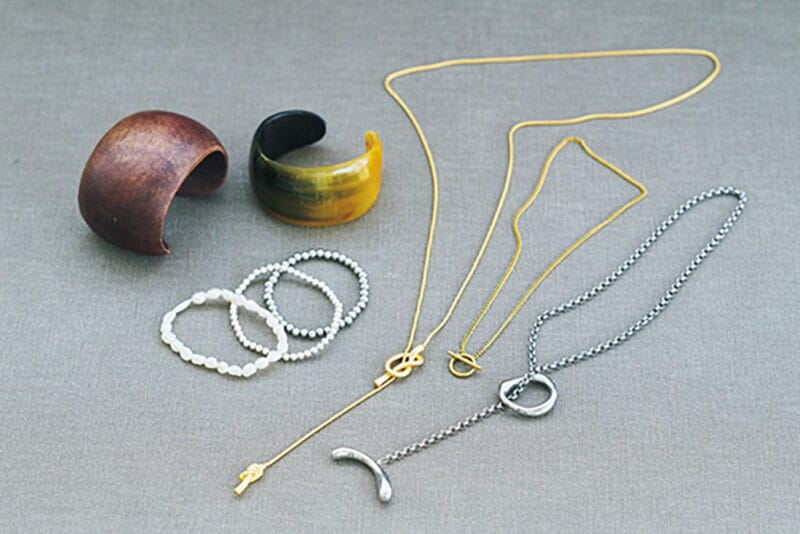 ネックレスを重ねづけしたり、大判ストールを輪にして首にかけるだけでがらりと変わります。