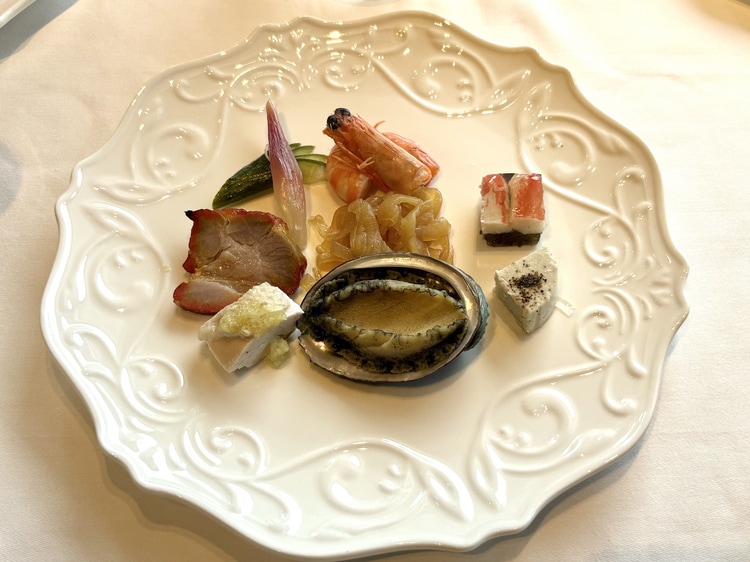食事の始まりを告げる温かな中華コンソメスープ『命のスープ』のあと、コースの最初に登場する一皿。厳選された鮑やくらげの他、季節の食材を味わえる盛り合わせになっています。