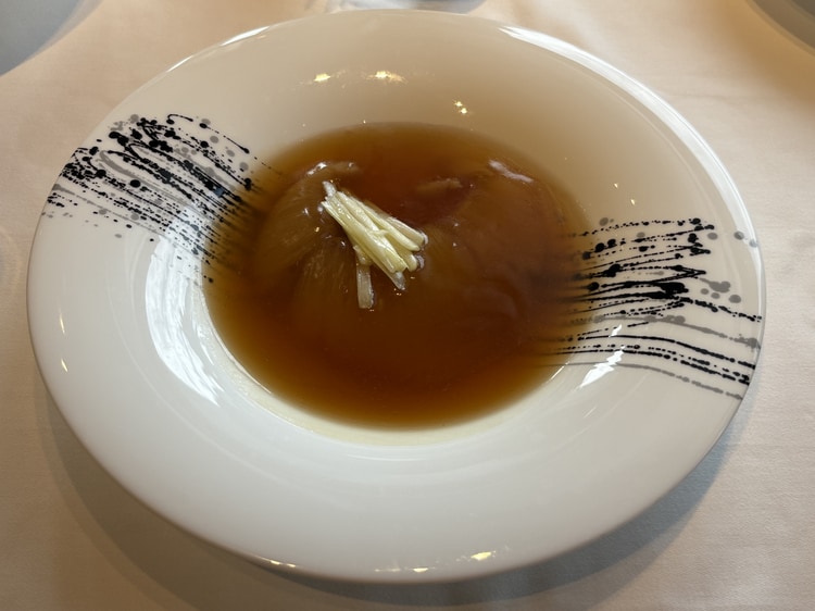 上質な気仙沼産のヨシキリザメのふかひれに、極上スープのあんがかかっています。ふかひれを“まるごと”いただける満足な一皿で、上にのった黄ニラが味わいのアクセントに