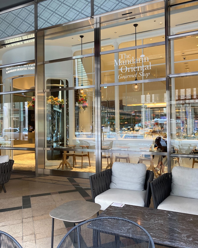 5つ星ホテル「マンダリン オリエンタル 東京」東京メトロ三越前駅直結、マンダリン オリエンタル 東京の1階にある「グルメショップ」。中央通りに面したガラス張りの外観とオープテラス席が品のある存在感を放ち、思わず足を止めたくなるような佇まいです。