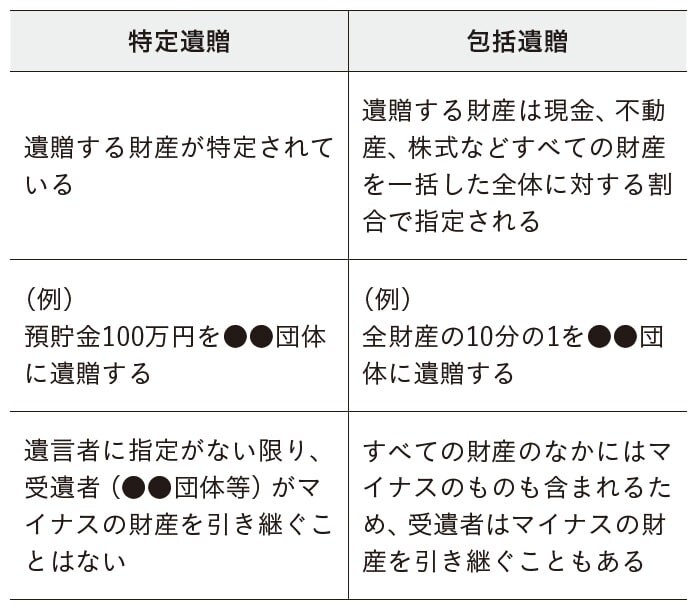遺贈とは、法定相続人以外の個人(友人等)や団体(日本ユニセフ協会等)に財産を贈る場合のことをいいます。この場合は、遺言書を書く必要があります。遺贈先については、遺贈財産(たとえば不動産)をもらわない場合がありますので、遺贈先の意思を確認したほうがいいと思います。また遺贈には二種類の方法があります。[図表1]を参照してください。