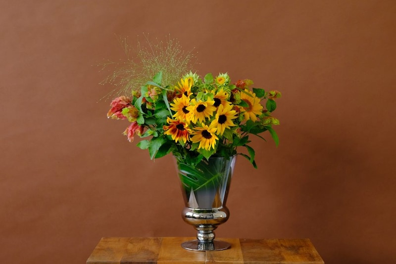 「ヒマワリ サンリッチマロン」「ヒマワリ バレンシア」「つぼみヒマワリ」など、さまざまな向日葵に、海老の尻尾に似ていることから、“小海老草”とも呼ばれる「ベロペロネ」、そして霞のような「スモークグラス」を合わせました。花器の中に忍ばせた「モンステラ」の葉がアクセントに。