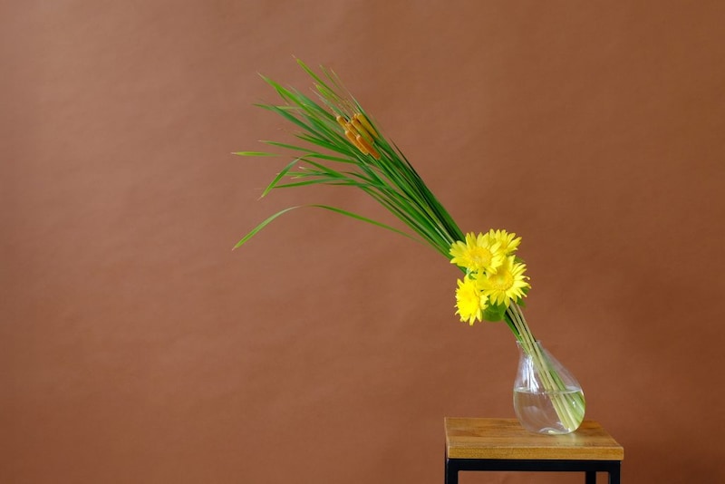 ここでは傾いたデザインの花器を使って斜めに生けていますが、口径の広い花器でも、同様に斜めに生けることができます。