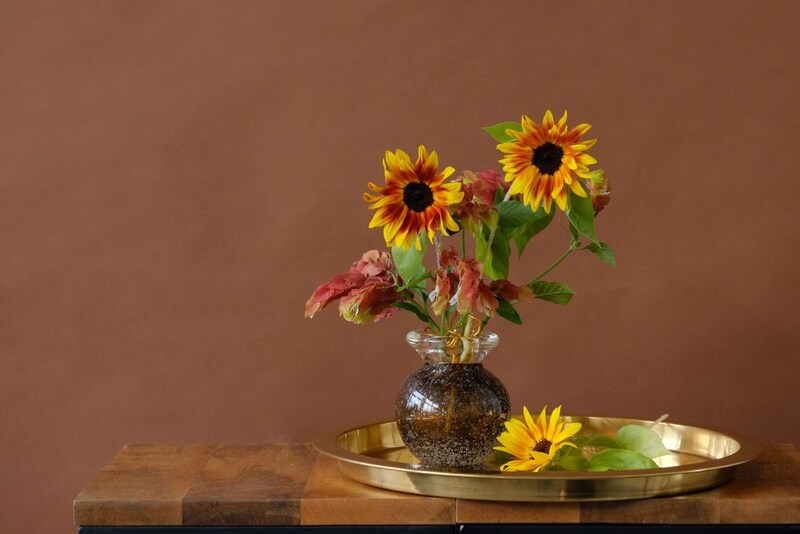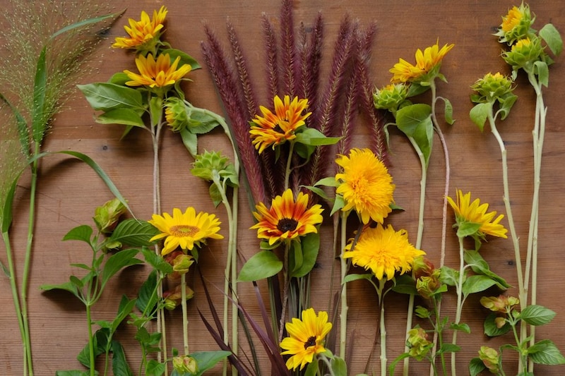 丈の長い向日葵の姿を楽しんだあとは、短くカットして生けてみましょう。