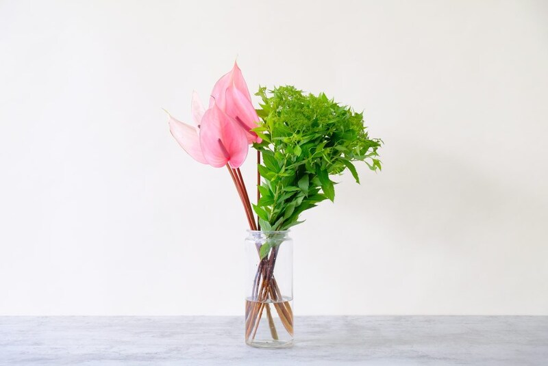 お手入れで短くなったアンスリウムに、まるでマリモのような『テマリソウ』を添えました。ユニークな形どうしが響き合い、愛らしい花あしらいに。