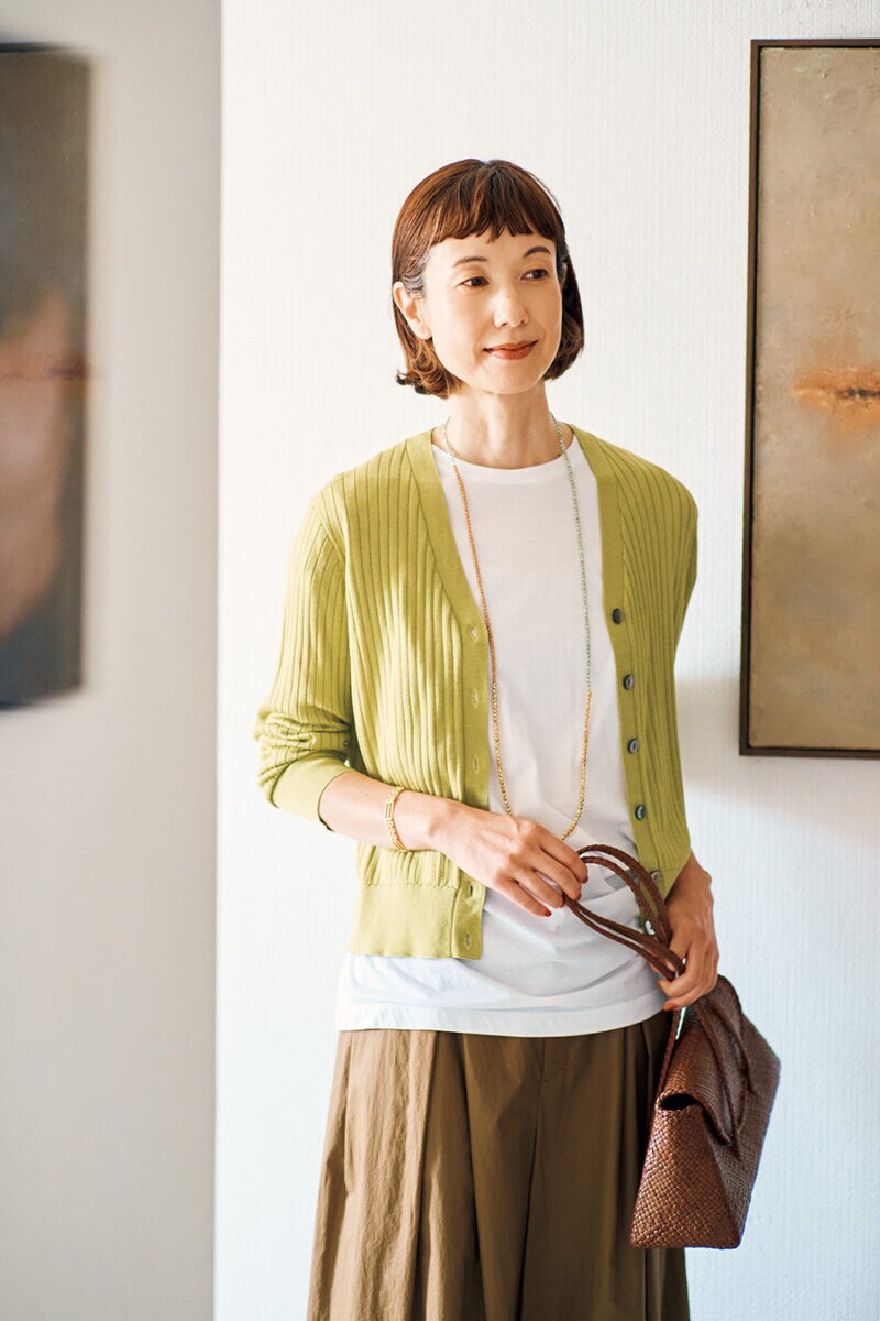 リブニットカーディガン¥17,600 /ソージュ(ソージュ オンラインストア)、中に着たカットソー¥15,400、ワイドパンツ¥35,200 /ともにプレインピープル(プレインピープル青山)、バッグ¥159,500/ヨーガンレール、ネックレス¥44,000 /フローリアン(アッシュ・ペー・フランス)、ブレスレット¥13,200 /サローネ サーティ(フォーティーン ショールーム)