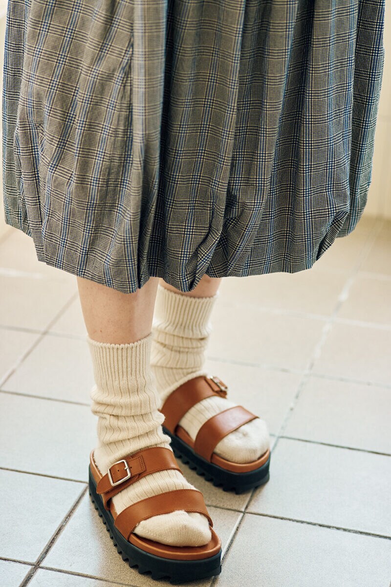 リブソックス¥9,900 /スローン(ザ ショップ スローン神戸)、サンダル¥35,200 /ヨーク(UTS PR)、スカート¥28,600 /バスコネスト(バスコ)