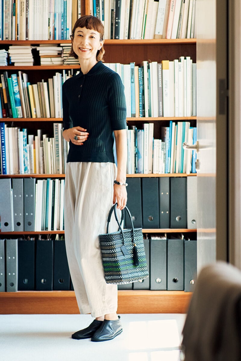 リブポロニット¥30,800 /スローン(ザ ショップ スローン 神戸)、パンツ¥16,500 /かぐれ(かぐれ ジョイナス横浜店)、かごバッグ¥15,950/ウーブン(アースマーケティング)、シューズ¥35,200 /プレインピープル(プレインピープル青山)、ブレスレット¥13,200、リング¥14,300 /ともにクロディーヌ・ヴィトリー(アッシュ・ペー・フランス)