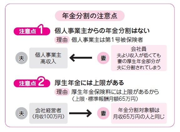 ここで注意したいことが2点あります。まず、どんなに高収入でも、個人事業者で厚生年金に加入していない人(第1号被保険者)は、分割の対象にはなりません。なぜなら、基礎年金(国民年金)は、個人に帰属するものなのだからです。