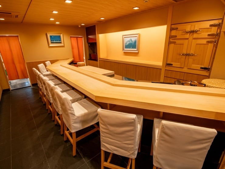 落ち着いた雰囲気の店内は、9席のカウンター席で構成された贅沢な空間です。寿司との相性を考えて厳選された日本酒は、定番から季節限定の銘柄まで常時10種類以上をそろえています。そのほか、プレミアシャンパンやワイン、ウイスキーもスタンバイ。記憶に残る料理やお酒が、家族や仲間との特別な時間を彩ってくれることでしょう。