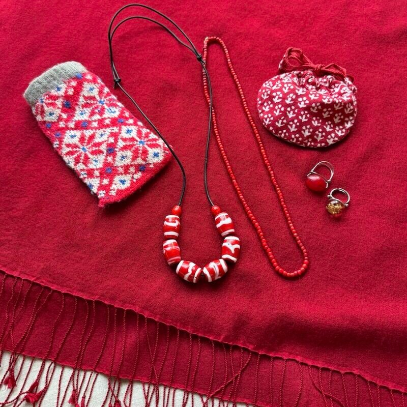 これからの季節の赤いアクセサリーです。気に入っているネックレスやペンダントは布の袋に入れてしまっています。赤い木の実のような小さなものは、袋から取り出すたびに、可愛い可愛いと思うのです。