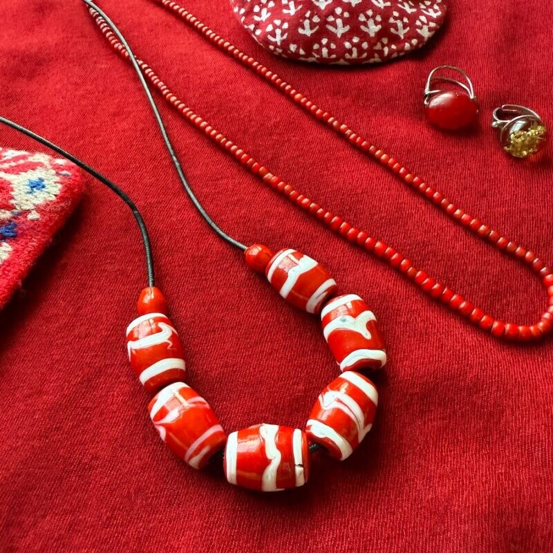 大きさが少しずつ違う大きなトンボ玉のネックレスは随分以前に自分で組んだのですが、今なら七粒にしたはずですし、間に薄いビーズを入れたかなと思います。今はなくなってしまいましたが、渋谷にアクセサリーのパーツを扱っている広くて雰囲気のあるお店がありました。トンボ玉、天然石、樹脂などのものが多く、とても好みでしたので、今もそのお店で購入したアクセサリーは変わらずに愛用しています。ヴィンテージの小さなビーズのネックレスは、20年ほど前に自由が丘にあったアジアの民芸品を扱うお店で買い求めました。小さな建物の2階にあったあのお店によく通いました。ただただ濃い赤が美しいと思い、着け続けています。