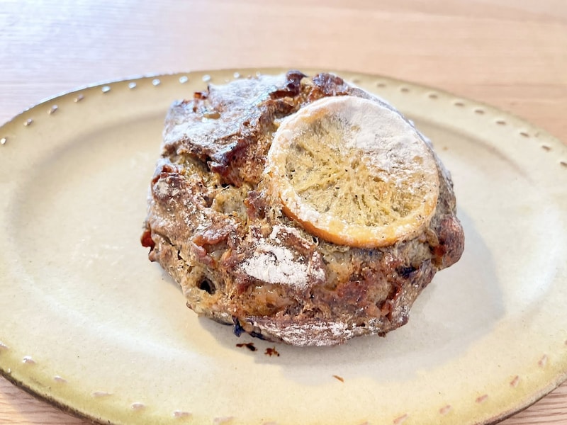 ほうじ茶をはちみつのパンの生地に練り込み、ネーブルオレンジ、ホワイトチョコ、アーモンドを合わせた、期間限定商品。