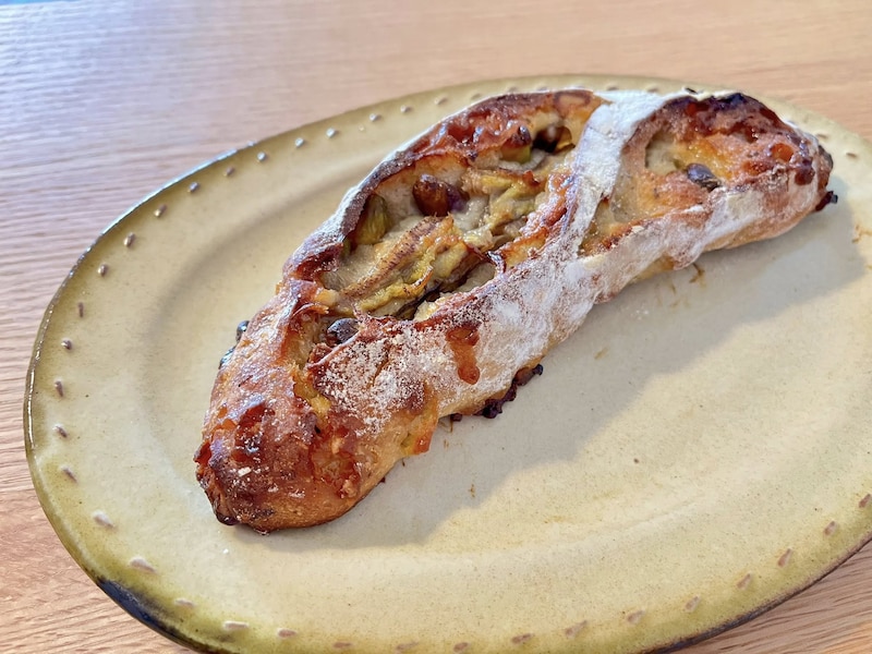 はちみつのパンにローストバナナ、ピスタチオ、カシューナッツ、ホワイトチョコを合わせたパン。