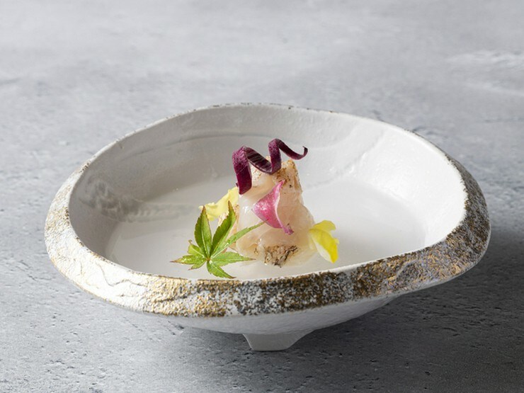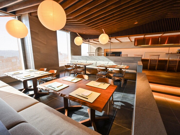 ホテルの高層階に位置し、窓から福井の街を一望できる店内は、伝統的な和の雰囲気と洗練されたモダンさを併せ持つ落ち着いた空間。福井の名峰「白山連峰」をオマージュしてつくられた天井など、洗練されたデザインが心地よさを生み出しています。料理を引き立てる越前焼の器や越前漆器、若狭塗の箸など、地元の伝統工芸品も必見です。