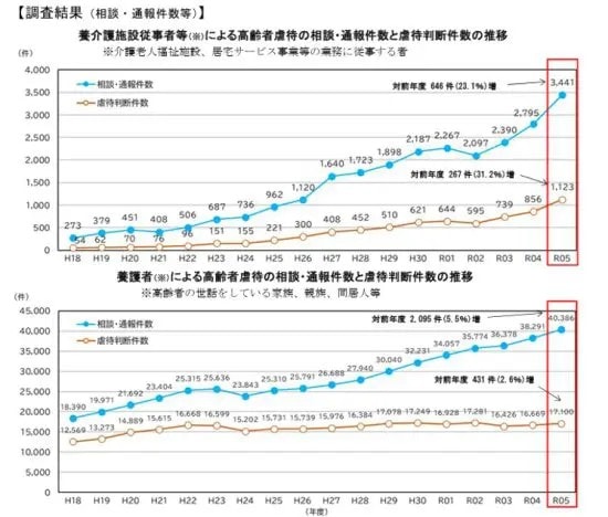 令和5年度の厚生労働省の調査では、介護施設従事者等による虐待は1,123件、養護者(家族等)による虐待判断件数は17,100件と、虐待は圧倒的に家庭で起きる(厚生労働省「高齢者虐待の防止、高齢者の養護者に対する支援等に関する法律」に基づく対応状況等に関する調査結果より)。