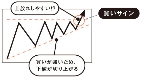 ラインを引いたとき、だんだんと下値が切り上がっている形の三角保ち合いが「強気の三角保ち合い」です。