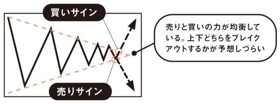 戦略としては、上下どちらかに株価が抜けた(ブレイクした)タイミングが売買のチャンスになります。