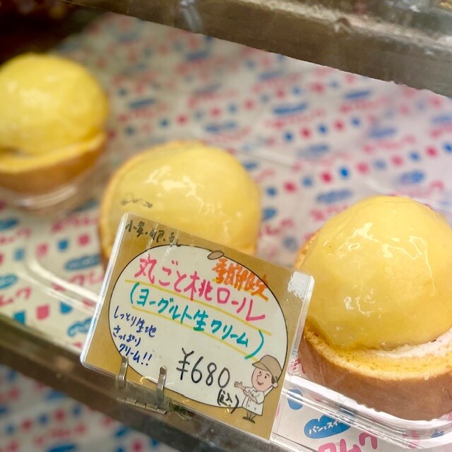 しっとりとしてカステラのような卵たっぷりのロールケーキ生地に、まんまるで愛らしいツヤツヤの桃が鎮座。