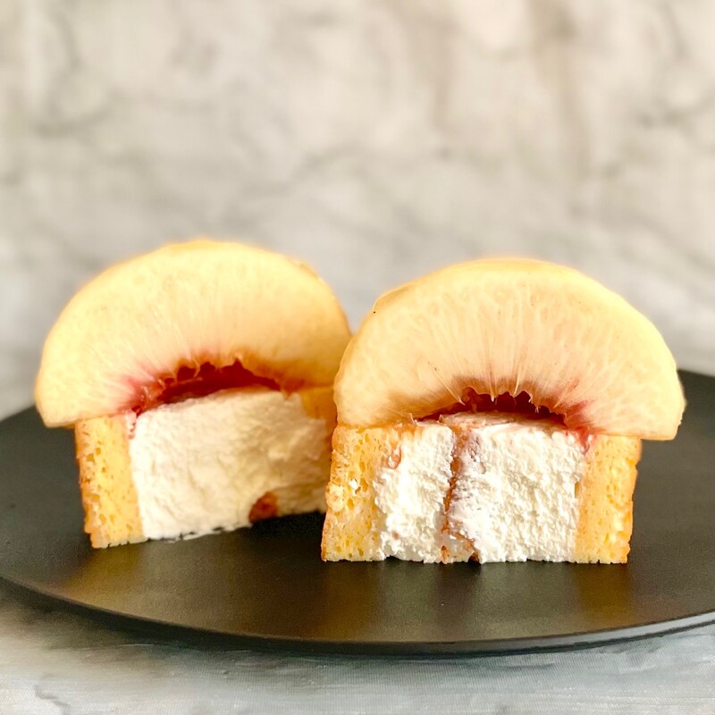 果汁滴る桃の甘い香りに包まれながら軽やかで爽やかな酸味のヨーグルトクリームと生地を一緒に味わうと、天にも昇る幸せな気持ちに~。