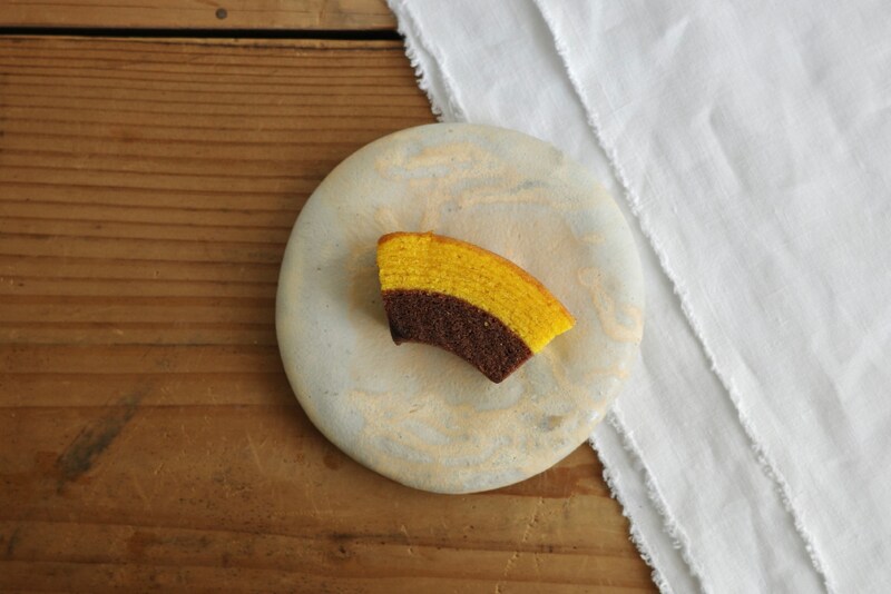 かぼちゃペーストを練り込んだ生地とチョコレートの濃厚な味わいが特長の生地の2層を組み合わせたカットバウム。秋らしい色合いと風味が楽しめる逸品です。