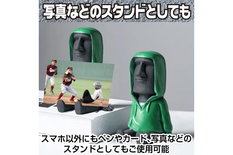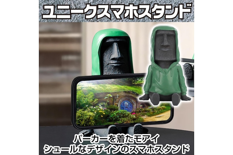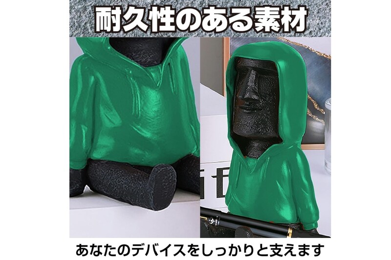 フーディーを着たモアイ像が、静かにあなたのスマホを支えてくれます。