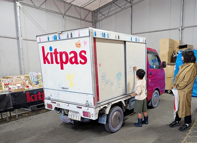また、日本理化学工業の画材「キットパス」を使った手形スタンプやキットパス号に絵を描いて楽しむことができる企画を設けた。さらに、“縁日”と銘打ったゲームコーナーとして、景品が当たる輪投げや的当て、豪華賞品が当たる抽選会も実施し、家族一緒に楽しむ姿が見られた。