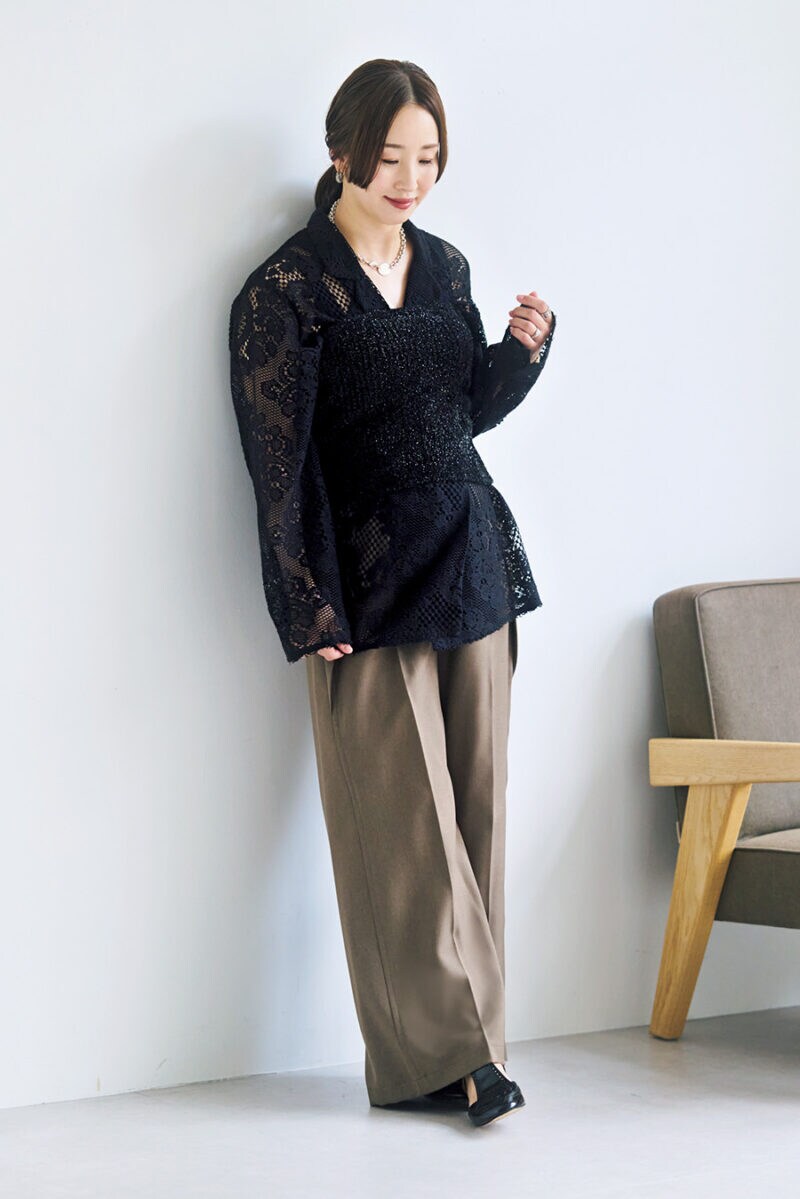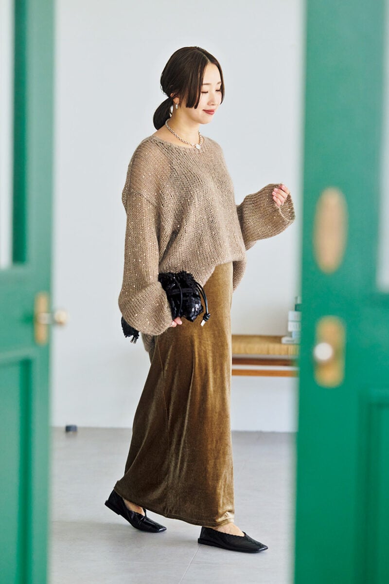 編地の透け感とスパンコールの光沢が華やかなニットは、ボトムを同色系で合わせてまとまりのある装いに。