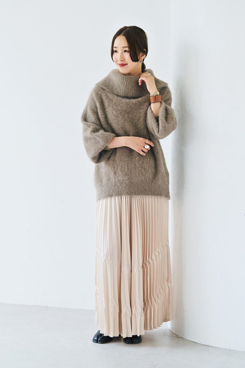 ボリュームニットは落ち感のあるプリーツスカートで軽やかに