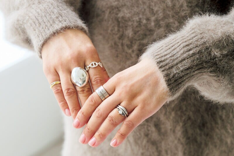 「右中指に大ぶりリングをつけるとバランスがとりやすいです」