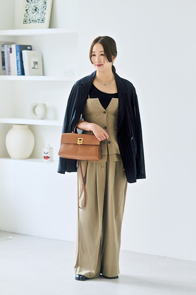ひとめぼれして買ったセットアップはジャケットを肩かけすることで落ち着いた雰囲気に。