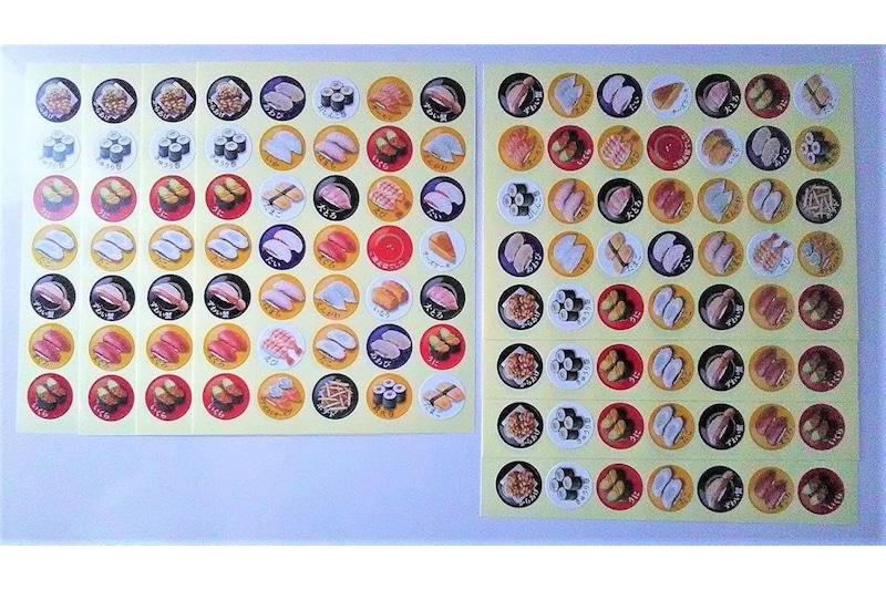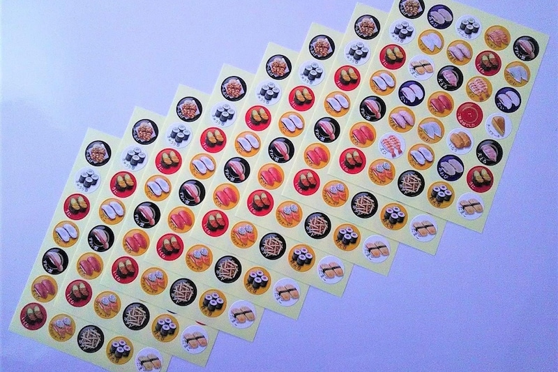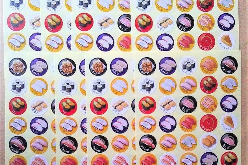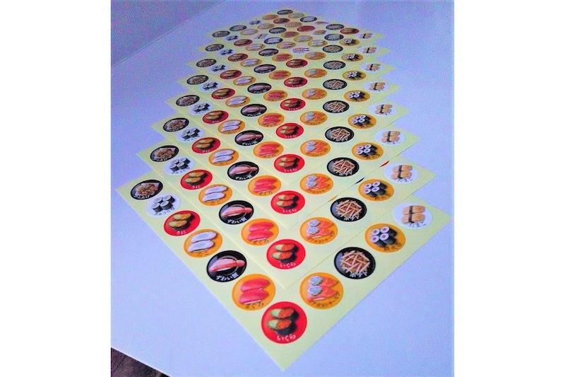 「協和紙工 回転寿司ポイントシール」は、リアルでかわいい寿司デザインが並ぶ人気のシールセットです。