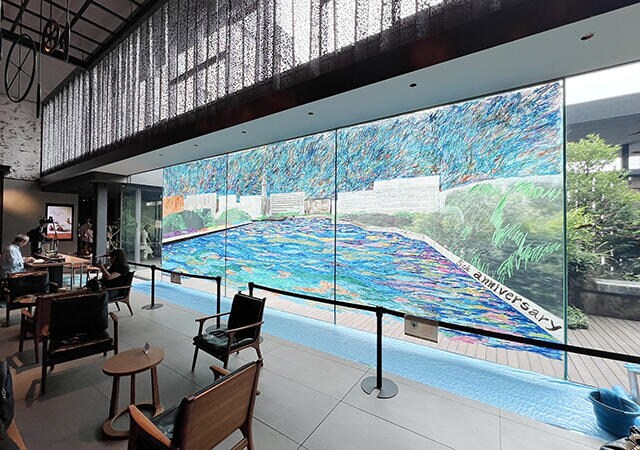 日本理化学工業は2025年9月15日、東京ベイ潮見プリンスホテル(東京都江東区潮見2-8-16)のフロントロビーのガラスウィンドウを活用し、アーティスト・西村公一さんによる「キットパスウィンドウアート」を実施した。
