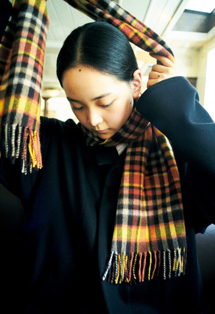 そろそろ始める秋のワードローブの準備。オーセンティックなチェック柄のマフラーは今年も欠かせない。イギリス・ヨークシャーで250年以上の伝統を持つ〈ジョシュアエリス〉の一本は、オレンジやイエローといった暖色に心も温まるし、カシミア100%だから肌触りのよさは抜群。明るいカラーリングだけどトーンは決して派手ではなく、これから増えるシックな装いの差し色にするのにも使いやすい。¥39,600(真下商事 03−6412−7081) コート¥110,000(コンテンポ/ヤエカ ホーム ストア 03−6277−1371)
