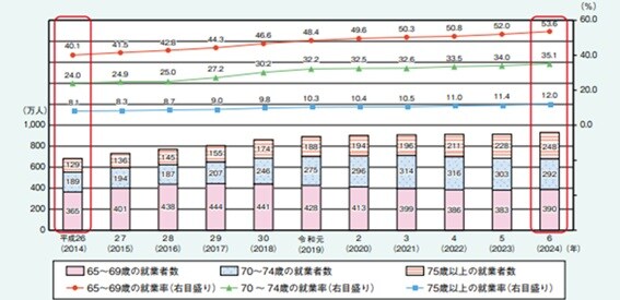 [図表]高齢者の年齢階級別、就業者数及び就業率の推移出所:内閣府「令和7年版高齢社会白書(概要版)」より引用