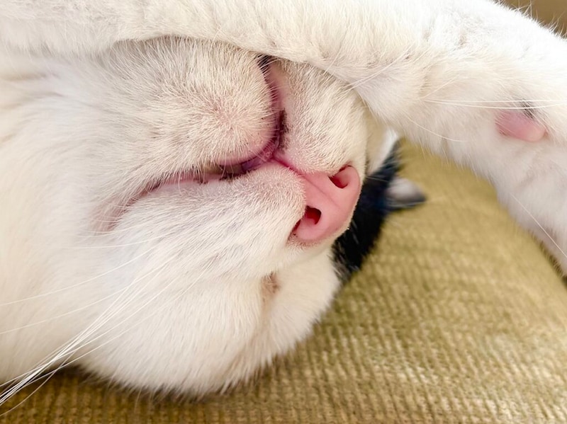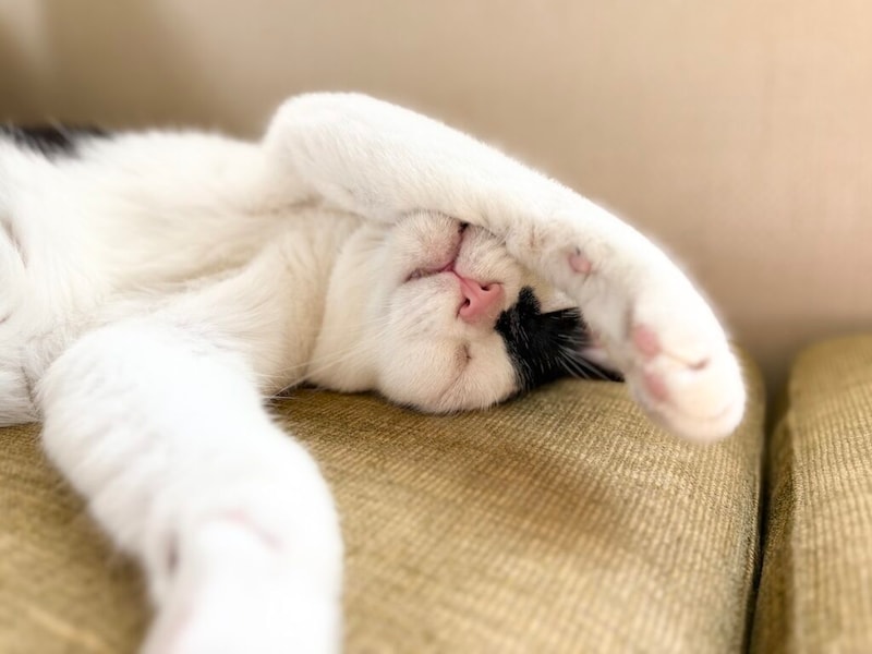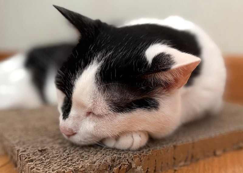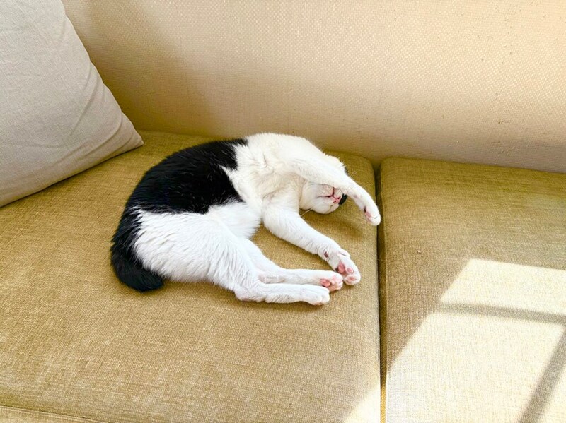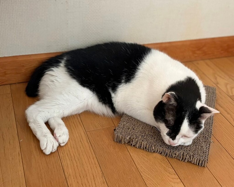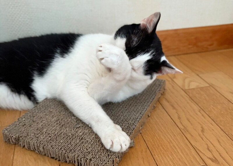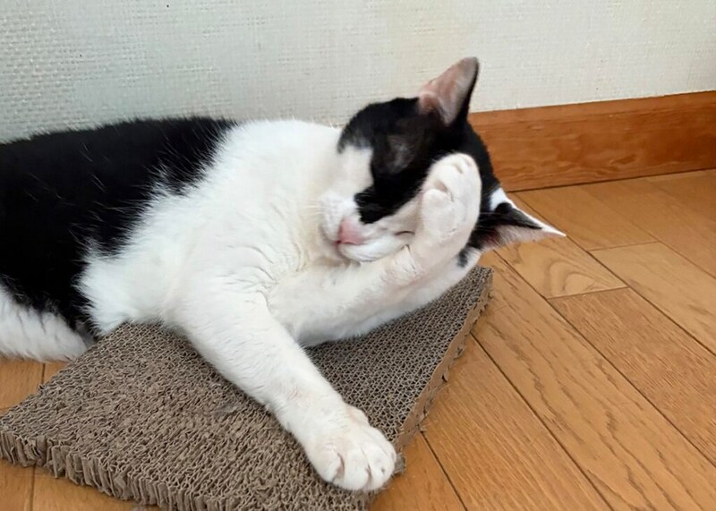 気圧が下がると、人間もだるくなるけれど、えいたもどうやら同じ。ただでさえよく寝ているのに、さらに寝る。晴れた日は、光を浴びるように前足を万歳してのびやかに寝ているけれど、雨の日は、爪とぎダンボールの上にぺたりと張りついて、湿気に撫でられているような寝姿だ。見ているこちらまで、つい、けだるくまぶたが重くなる。