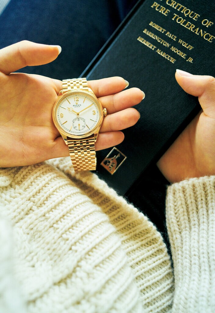 〈ロレックス〉の「パーペチュアル 1908」は、18Kイエローゴールドのブレスレットの存在感に比して、クラシックさを極めた秒針やサンセリフ体のインデックス、スリムなケースといったディテールは実に控えめ。肌馴染みもよく、エレガントで飽きのこない魅力を持つ一本だ。聞けば初代「オイスター パーペチュアル」をオマージュしているといい、この完成された美しさに納得。¥5,273,400(日本ロレックス 0120−929−570) ニット¥34,100(ペレグリン/真下商事) デニムパンツ¥33,000(A.P.C./アー・ペー・セー カスタマーサービス 0120−500−990)その他スタイリスト私物
