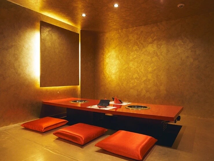 大通りから裏道に入った地下にある焼肉店【牛牛】。隠れ家のような扉を開けると、照明を落とした大人の空間が広がっています。金色の壁に囲まれた特別個室や、仕切りを調整できる個室があるので、人数やシーンによって使い分けられるのも魅力。接待やデートに訪れて、思い出に残る素敵な時間が過ごせるお店です。