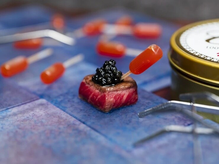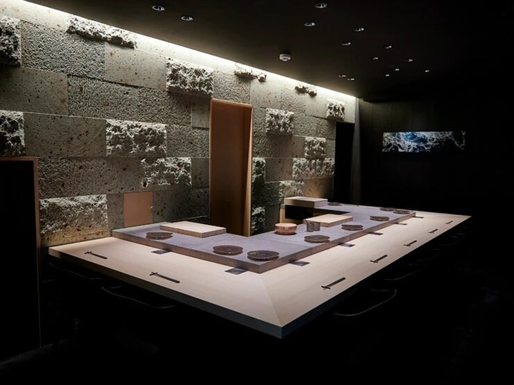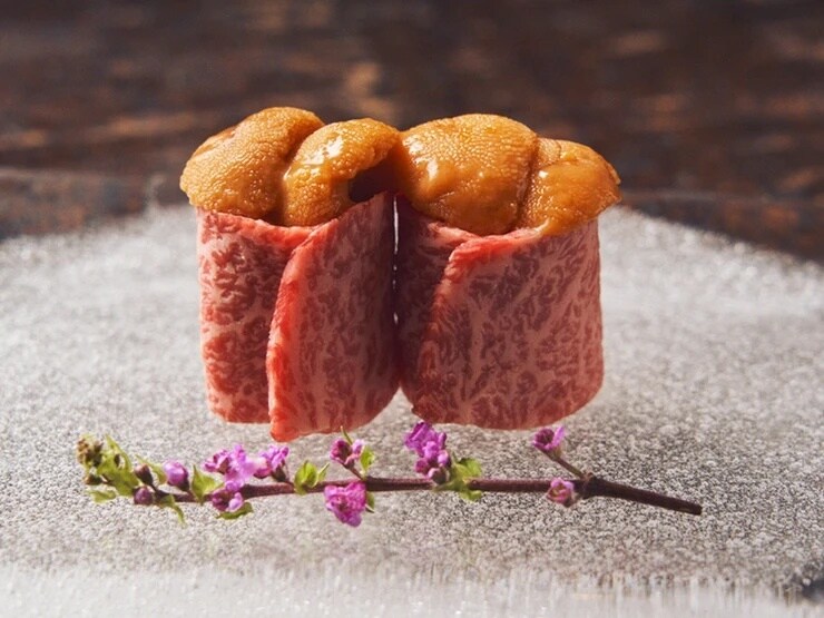 銀行をコンセプトにした斬新な空間。ステンレスで覆われた通路は貸金庫へと続く道のようで、訪れる者にワクワク感を提供しています。焼肉×フレンチを融合させた料理を楽しめ、一部はゲストの目の前で完成。例えば『ヴァンク“スカンビーノ”(黒毛和牛タルタル)』は、塊肉から専用マシンで挽き、盛付けまでのプロセスを楽しめます。