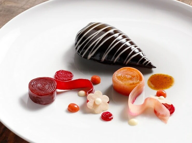 『シャンパーニュ地方の赤ワインソースを纏った仔鳩のファルシー ビーツのスパイラル』