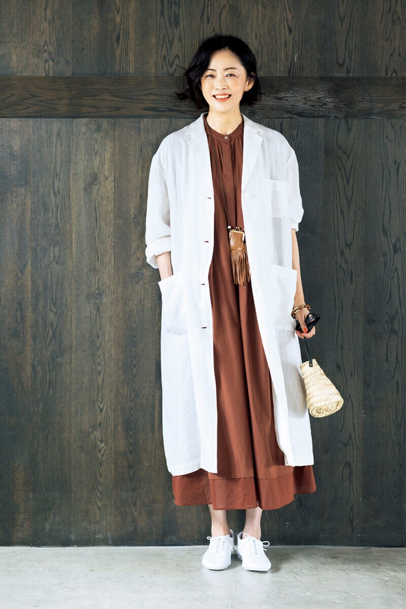 ノースリーブワンピースにはおり、白で涼やかな印象に