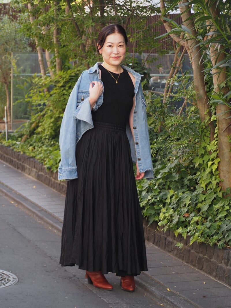 黒をベースにしたシックな装いに、デニムジャケットをオン。さらっと肩掛けすることで抜け感が増し、きれいめとカジュアルがバランスよく両立。一枚でコーディネートが完成する「ハーリップトゥ」のワンピースは異素材の切り替えがポイント。