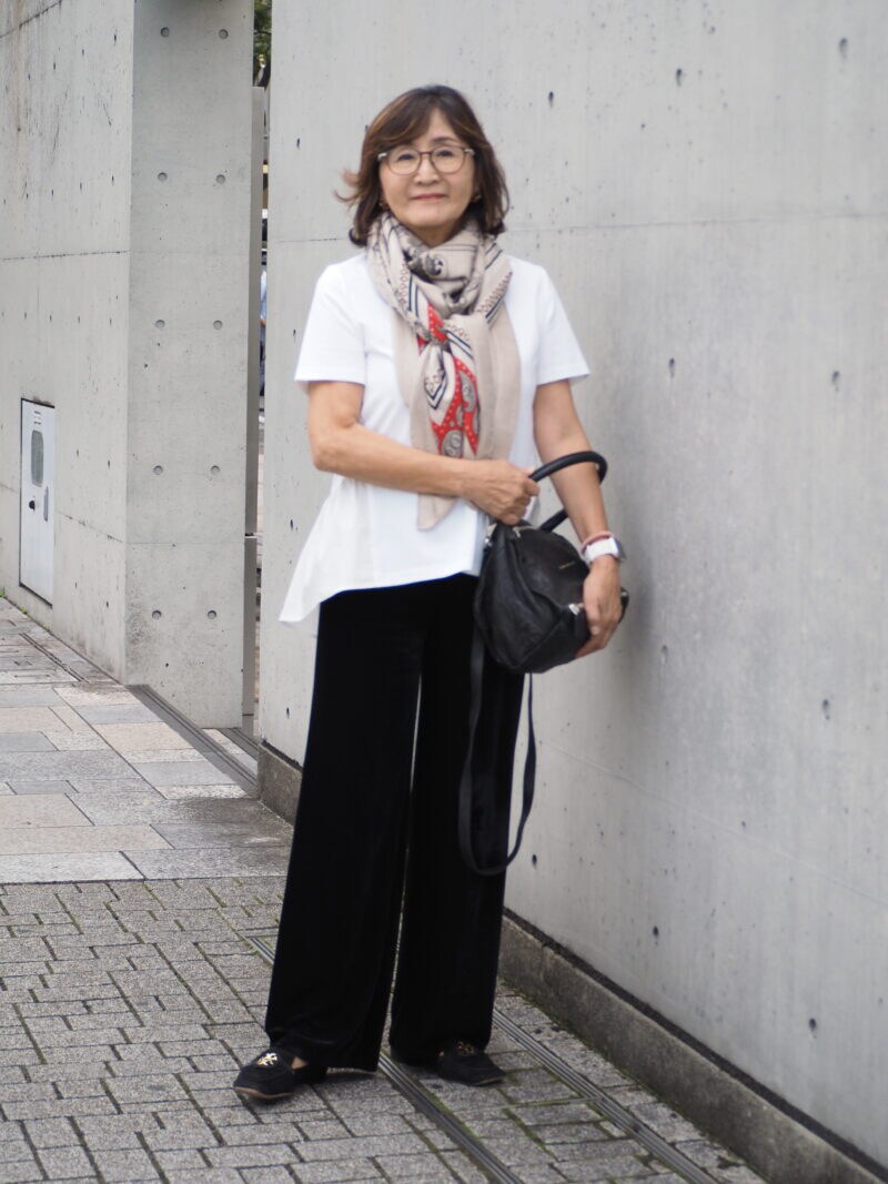 Tシャツにパンツを合わせたシンプルなワンツーコーディネートは、小物で遊び心をプラス。「エルメス」のストールをひと巻きするだけでぐっと上品な印象に。今季購入した「トゥモローランド」のベロアパンツで季節感を取り入れて。