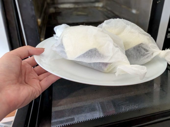 クッキングシートで包む [食楽web]4.耐熱皿にのせ、かけて電子レンジで加熱(600Wで約2分半目安)。
