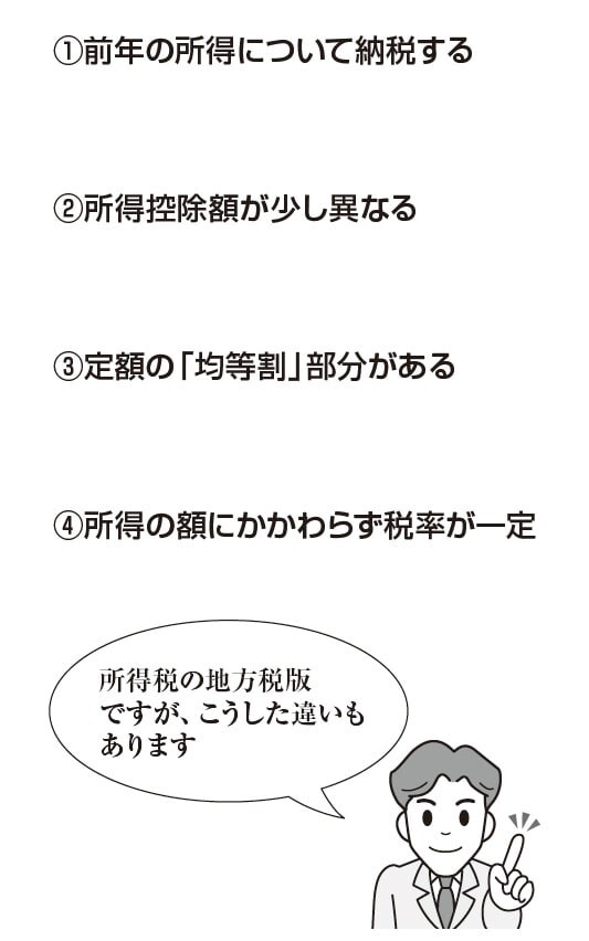 第1に、所得税と違って、前年の所得について次年の6月から次々年の5月にかけて納付すること。第2に所得控除の額が所得税と少し異なること。第3、第4には所得税にない「均等割」の部分があり、「所得割」は超過累進税率でないことがあげられます。